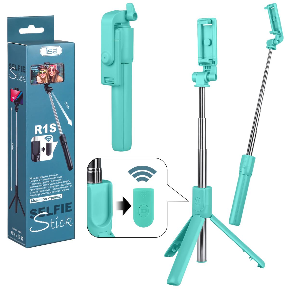 *Монопод-трипод с блютуз пультом, R1S ISA изумрудный Батарейка CR1632 приобр. отдельно (100шт/кор)